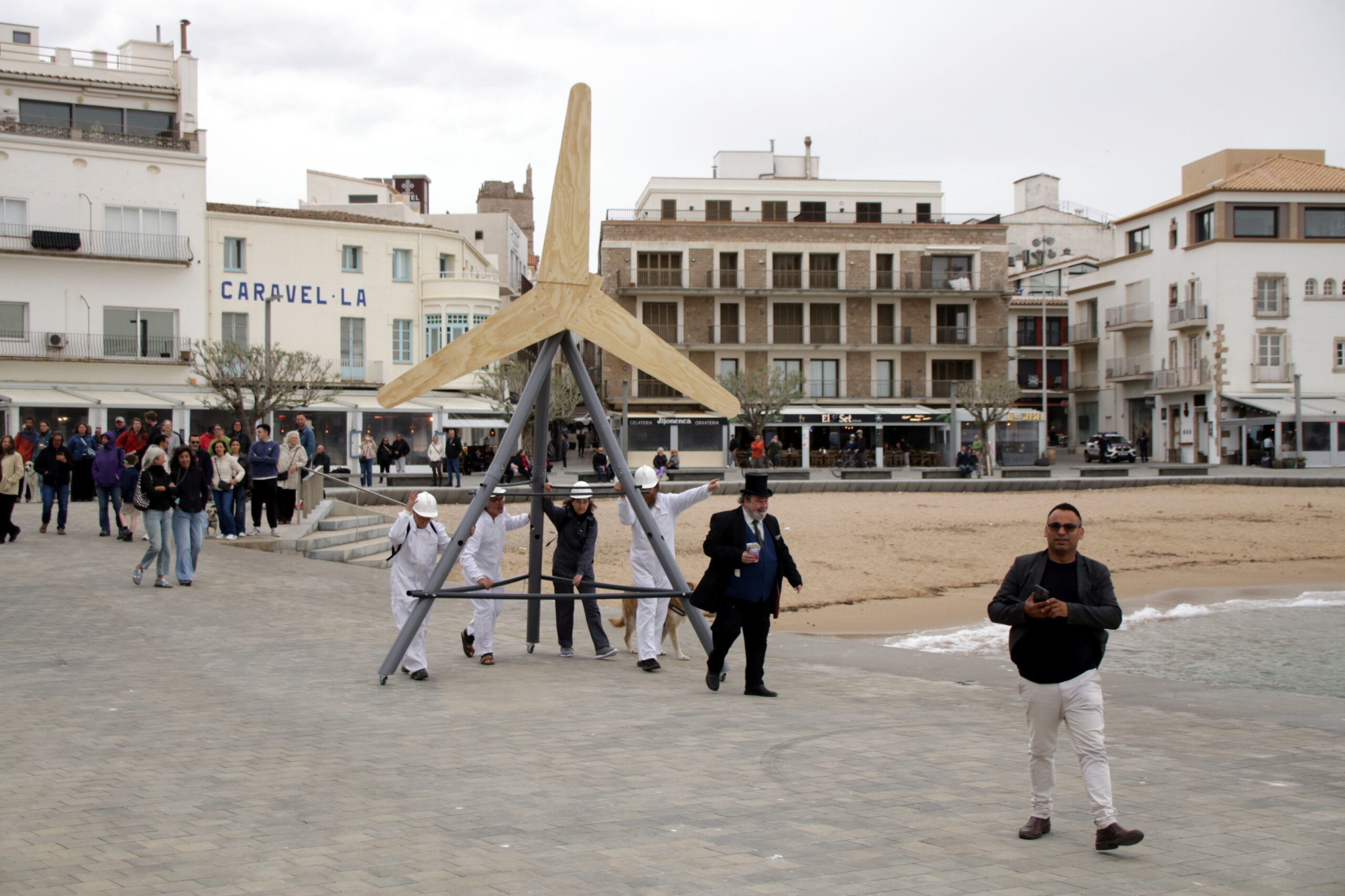 Finalment, amb la banda sonora de La Guerra de les Galàxies, un molí eòlic muntat sobre una plataforma amb roses ha avançat cap als participants i, en apropar-s’hi, tant els “animals” com els “veïns” han caigut a terra, escenificant la mort de la biodiversitat i la pèrdua de la qualitat de vida.