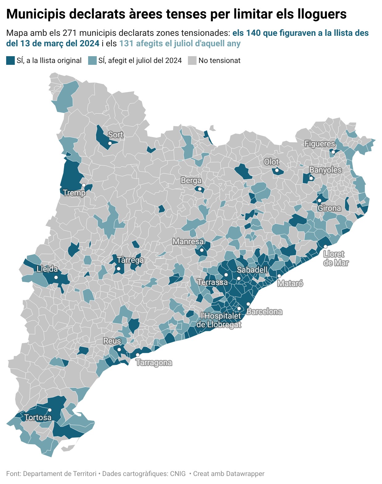 Ara, però el document elaborat per la Generalitat aclareix que aquests cinc immobles hauran d’estar situats en una de les dues zones declarades per considerar-se gran tenidor. A la primera zona hi ha pràcticament totes les localitats de l’àmbit metropolità de Barcelona; les quatre capitals, part de les comarques costaneres i d’altres de muntanya com Ripoll, Puigcerdà, Mollerussa, Solsona o Torelló, entre d’altres. A la segona s’hi inclouen localitats com Vielha, Cadaqués, Begur, Besalú o Altafulla, entre d’altres.
