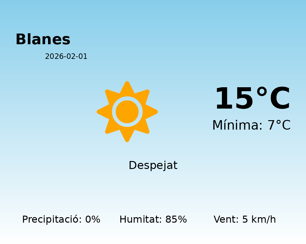 Avui, 1 de febrer de 2026, Blanes gaudirà d’un dia tranquil i moderadament fred. Després d’una nit més fresca, amb una temperatura mínima de 7°C, el mercuri pujarà fins als 15°C al llarg del dia.