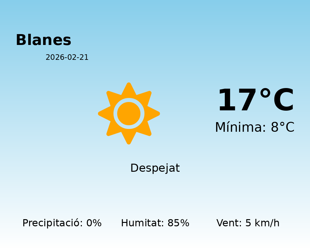 Avui a Blanes, el temps es presenta amb unes condicions força agradables per a aquesta època de l’any. La predicció meteorològica indica que tindrem una temperatura màxima de 17°C i una temperatura mínima de 8°C. Aquestes temperatures moderades són ideals per a activitats a l’aire lliure.