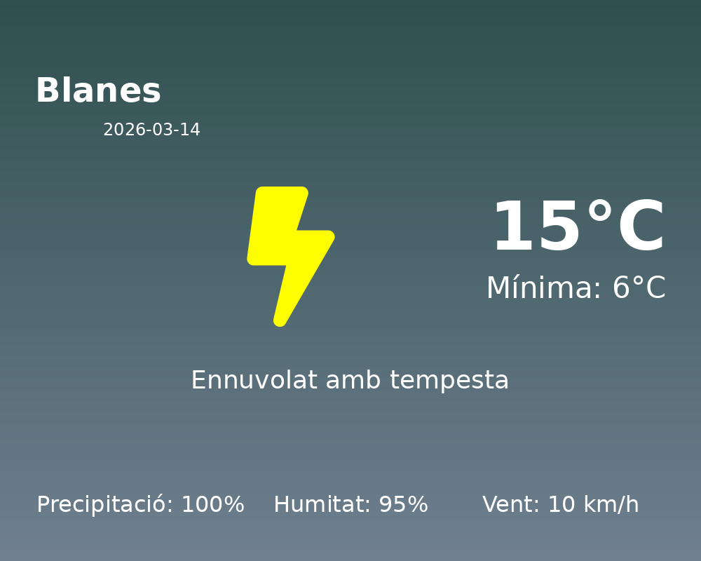 Avui, 14 de març de 2026, el temps a Blanes es presenta amb característiques marcadament humides i inestables. Els ciutadans hauran de preparar-se per a una jornada amb abundant precipitació, ja que s’espera un 100% de probabilitat de pluja durant tot el dia.
