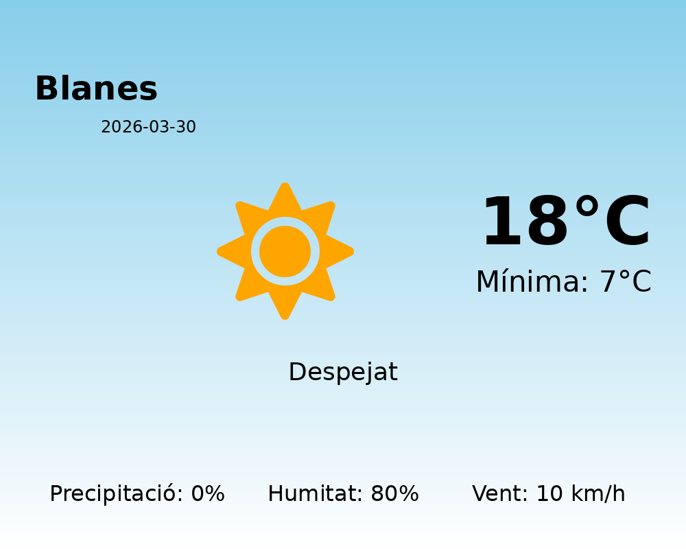 Avui a Blanes, gaudirem d’un dia amb temperatures agradables pròpies d’inicis de la primavera. S’espera una temperatura màxima de 18°C i una mínima de 7°C. Això suposa una sensació tèrmica força còmoda durant el dia, mentre que al matí i a la nit caldrà portar una jaqueta per evitar el fred.