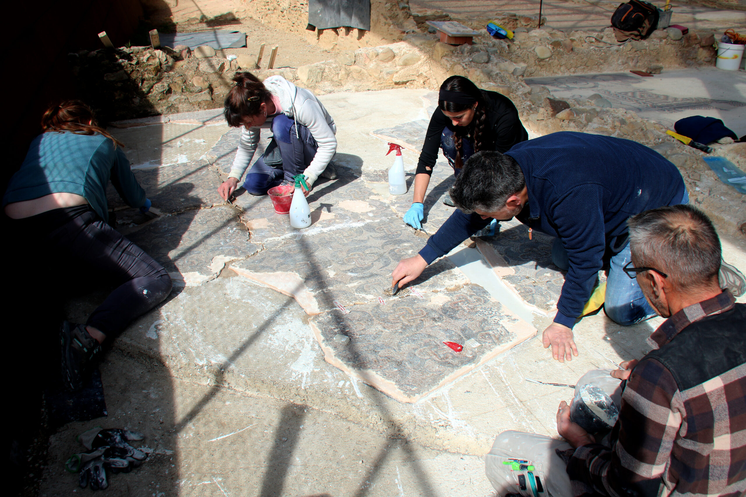 En total, els restauradors han tornat a lloc catorze fragments diferents d’aquest últim mosaic. I aquests dies estan reintegrant les tessel·les que els unien. Per saber exactament on anava cada pany, s’han servit de croquis i documentació dels anys 70. El responsable de Signinum Restaura explica que s’ha treballat “al mil·límetre” i, de fet, defineix la seva feina com haver fet “arqueologia de l’arqueologia”.