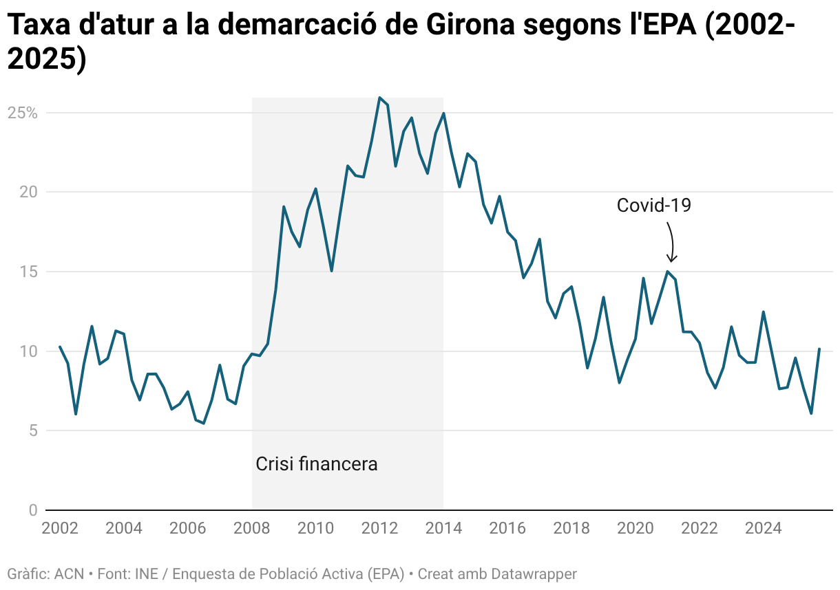 A les comarques gironines, el 2025 es tanca amb 43.300 aturats i una taxa d’atur que torna a enfilar-se per damunt del 10% (en concret, el 10,13%). Per trobar un percentatge que ho superi, cal remuntar-se més d’un any i mig enrere, fins a principis del 2024. Perquè aleshores, al primer trimestre la demarcació va assolir una taxa d’atur del 12,47%.