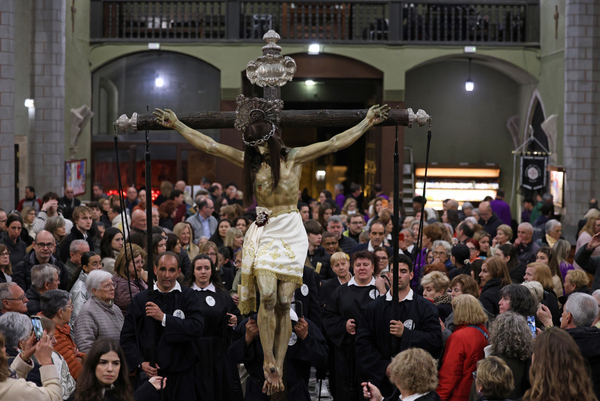 Fran Domínguez, de 53 anys, va ser l’encarregat de portar la creu del Sant Crist, un pes de 90 kg que el portador ha de carregar durant tota la processó. Els assistents van poder seguir aquest moment intens gràcies a una pantalla de vídeo instal·lada a la plaça de l’Església.
